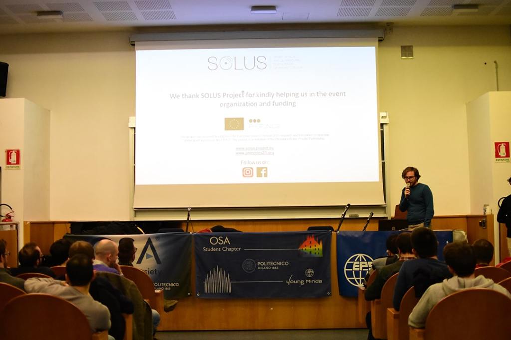 Streaming the online conference Photonics Online Meetup (POM) in the Auditorium of Politecnico di Milano.
