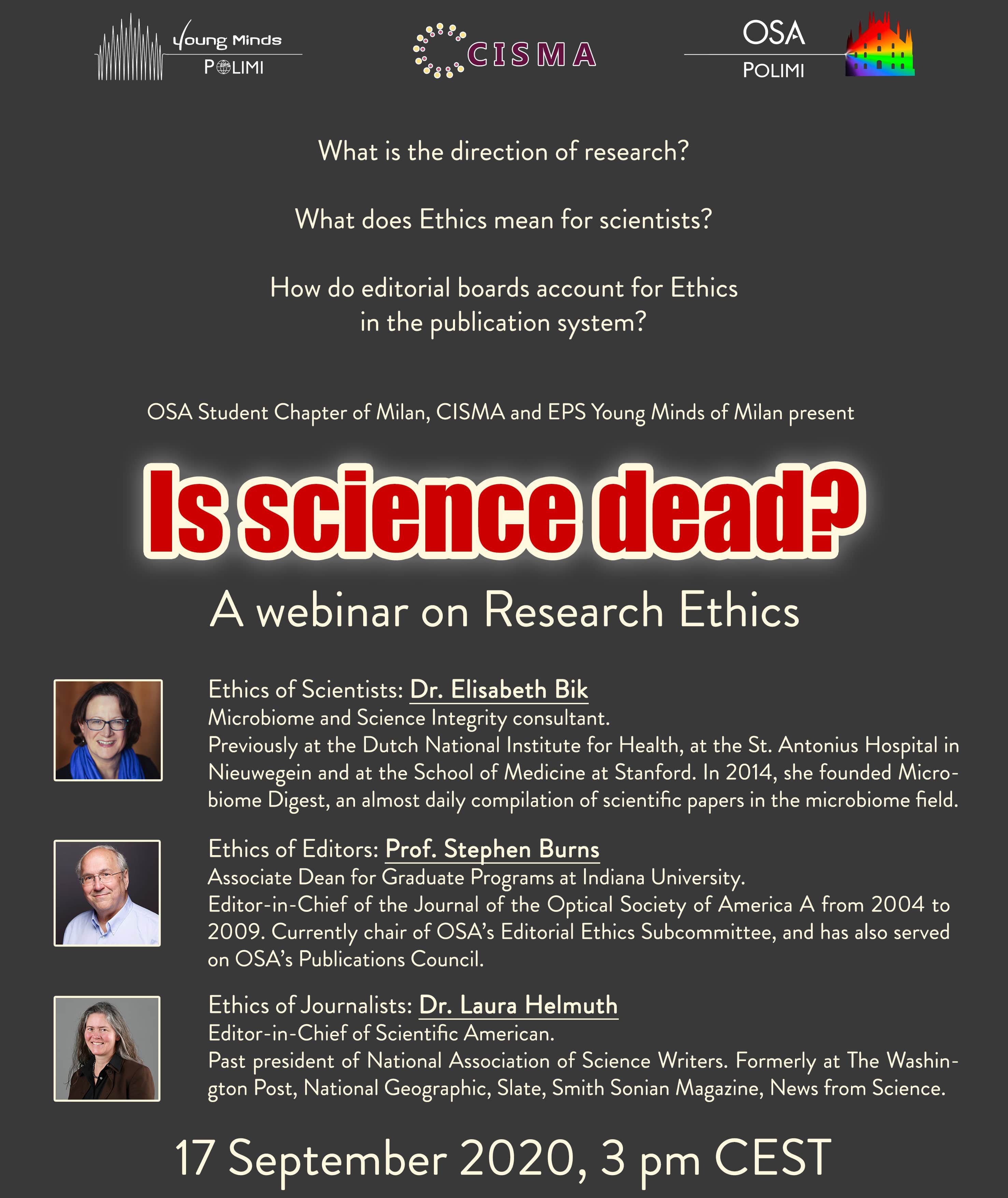 A webinar on Research Ethics, discussing ethics of scientists, ethics of editors and ethics of journalists with three worldwide experts in the topic.