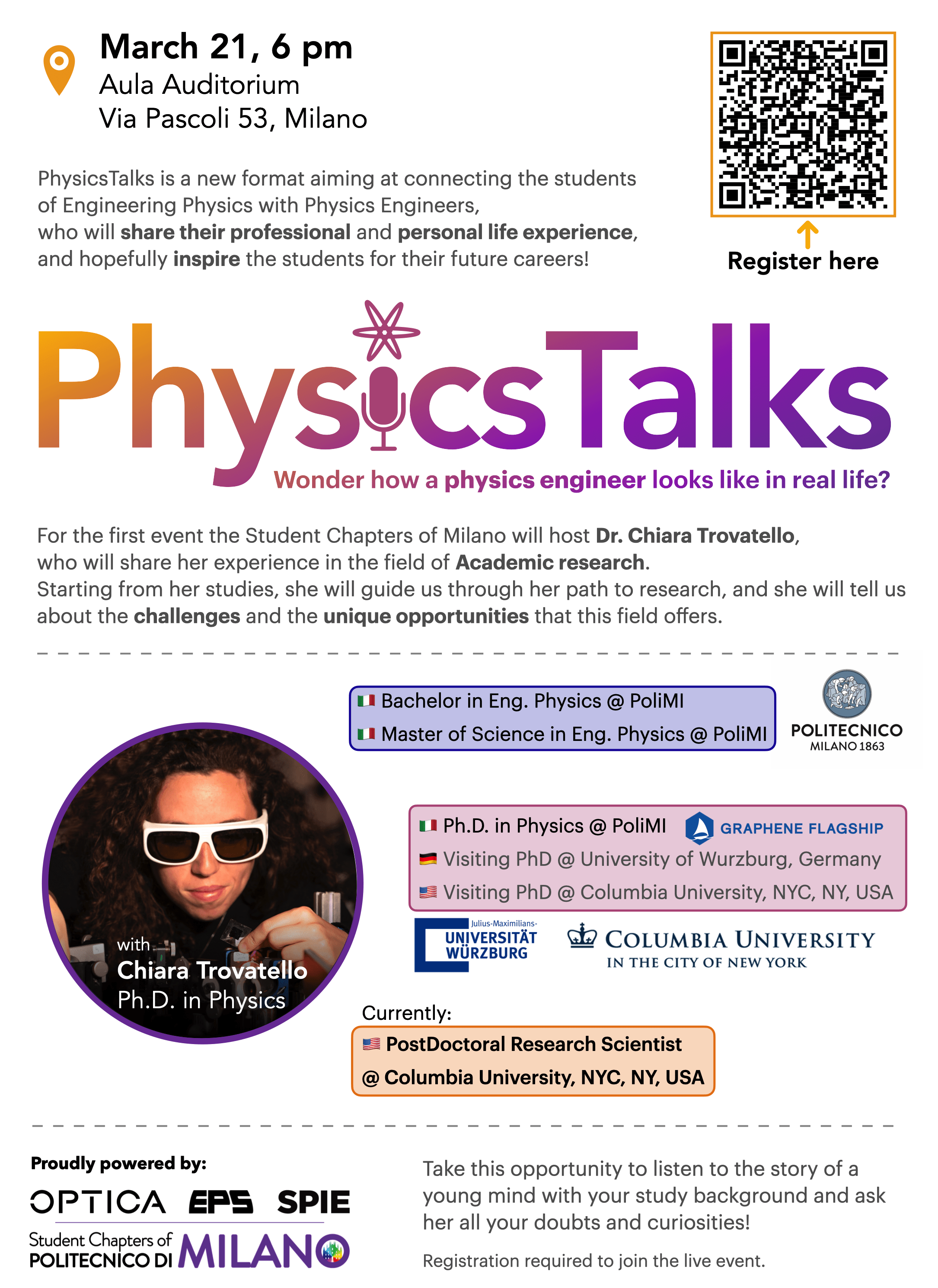 In collaboration with the Physics Department, the Optica, EPS and SPIE Chapters of Milan created “Physics Talks“: a new format to connect the students of Engineering Physics with Physics Engineers, who share their professional and personal life experiences and inspire the students for their future careers!