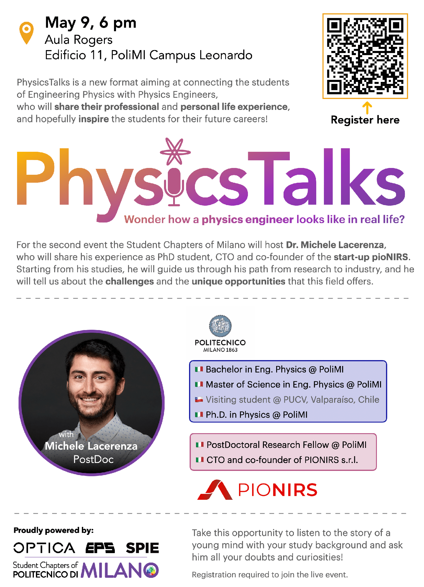 In collaboration with the Physics Department, the Optica, EPS and SPIE Chapters of Milan created “Physics Talks“: a new format to connect the students of Engineering Physics with Physics Engineers, who share their professional and personal life experiences and inspire the students for their future careers!