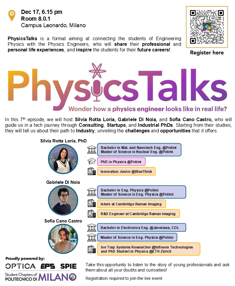 In the 7th edition of Physics Talks Student Chapters of Politecnico di Milano are happy to announce three alumni of Politecnico Physics Department.